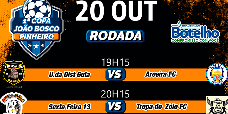 A programação terá início às 19h15 com o jogo entre Unidos do Distrito da Guia e Aroeira FC. Na sequência, as 20h15, será a vez do Sexta Feira 13 medir forças com a Tropa do Zoio FC.